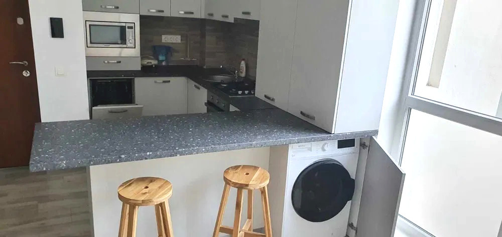 Bucataria este mobilata si utilata complet, dotata cu toate electrocasnicele necesare.