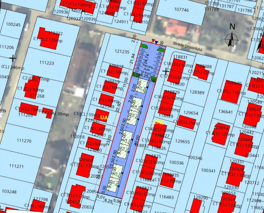 Terenul are o formă trapezoidală, cu o deschidere de 16,25 metri și o adâncime de aproximativ 105 metri, aspecte care permit o organizare eficientă a construcțiilor. Este liber de sarcini și fără edificii existente. Conform certificatului de urbanism, terenul este încadrat în zona 2Lp – locuințe individuale, cu regim de înălțime maxim P+2, POT 35% și CUT 1.